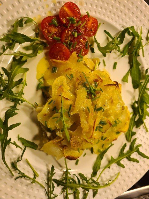 Fisk är underbart! Här är en god och trevlig variant från Gran Canaria: ugnsbakad plattfisk under potatistäcke.