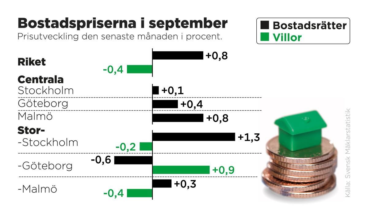Störst prisökning i september stod bostadsrätter i Storstockholm för, med plus 1,3 procent. I landet som helhet steg priserna på bostadsrätter med 0,8 procent.
