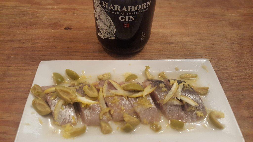Häll av vätskan och lägg upp bitarna på ett fat. Droppa över ny gin och strössla finrivet och finstrimlat citronskal över sillen. Lägg på halverade gröna oliver, gärna sardellfyllda. Serveras väl kyld.