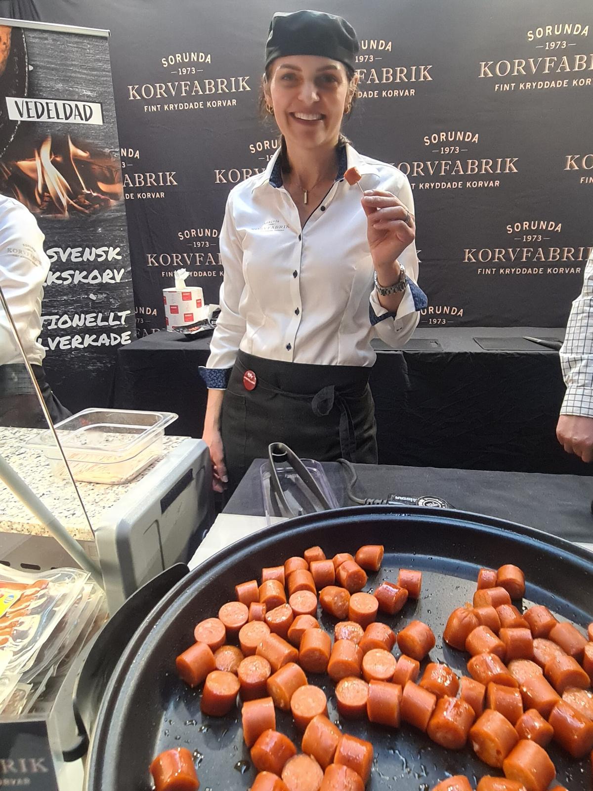 Stora och små korvfabrikanter samsas på festivalen. Direkt vid entrén mötte jag den strålande Madeleine Lindqvist från Sorunda korvfabrik. Där jobbar nu tre generationer – och storsäljaren heter förstås Lindqvistare, en härlig grillkorv. Yngsta lindqvistaren i korvfabriken är Maddes dotter Maja, 15 år: