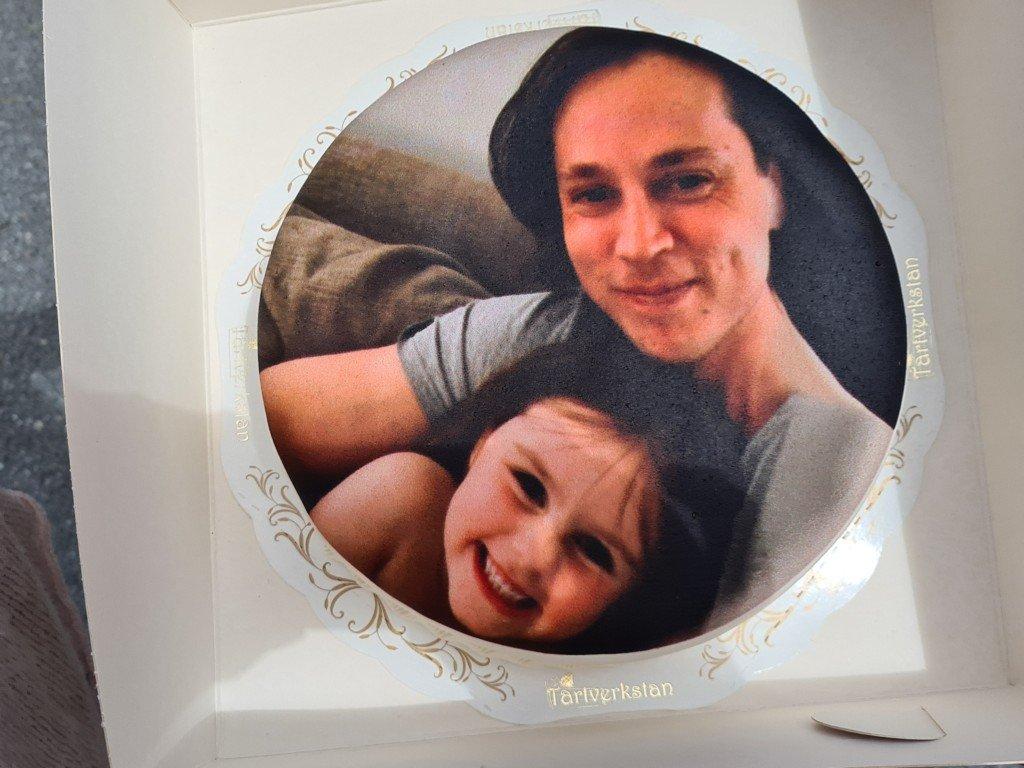 Sagt och gjort. Och Tårtverkstan i Täby fixade resultatet. Det var bara att mejla in ett foto, och dan efter var tårtan klar.