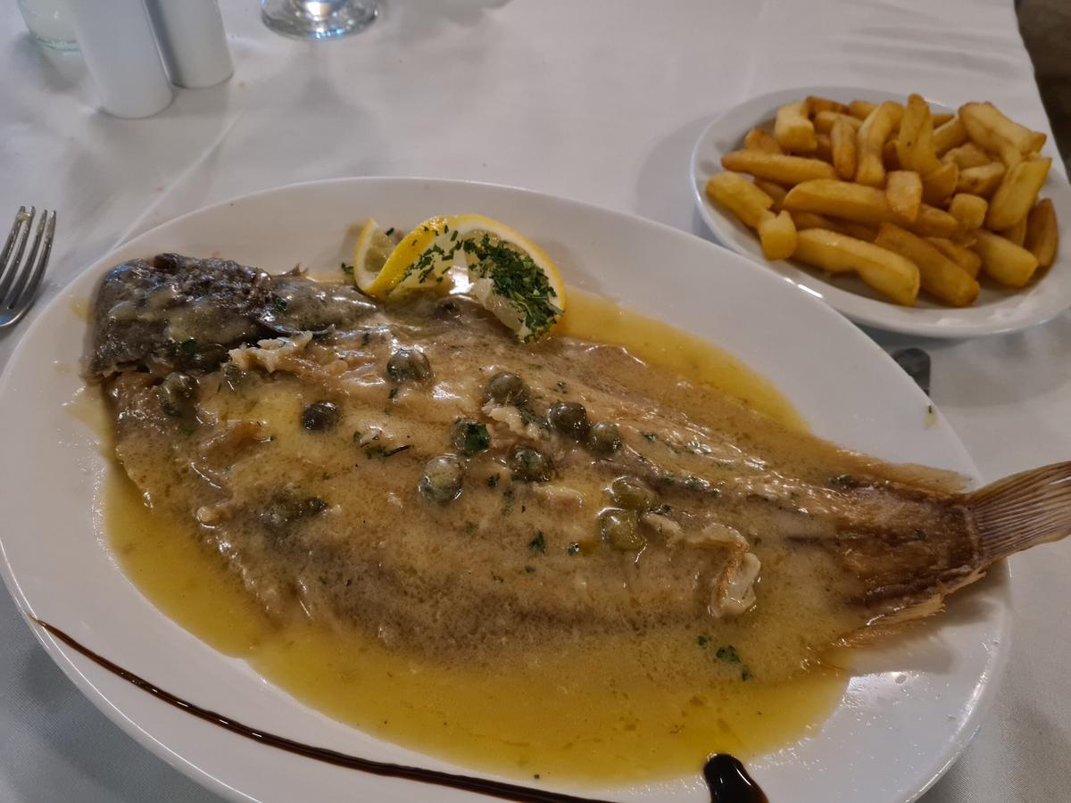 Vem har råd att äta sjötunga numera? Kan man undra när den kostar 2.400 kronor kilot på sina håll hemma i Sverige. Men där jag är nu har man råd! 10 euro för en stor, fin tunga!