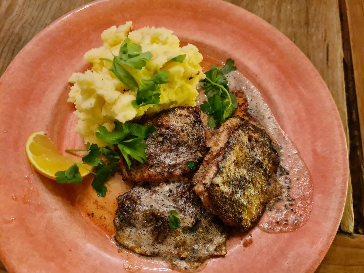 Filéerna fick vila i tjock grädde, blandad med två sorters senap i en timme. Ju längre dess bättre! Sedan en lätt panering med ströbröd och så stekning i smör. Med gott potatismos blev det förstås en ren delikatess.