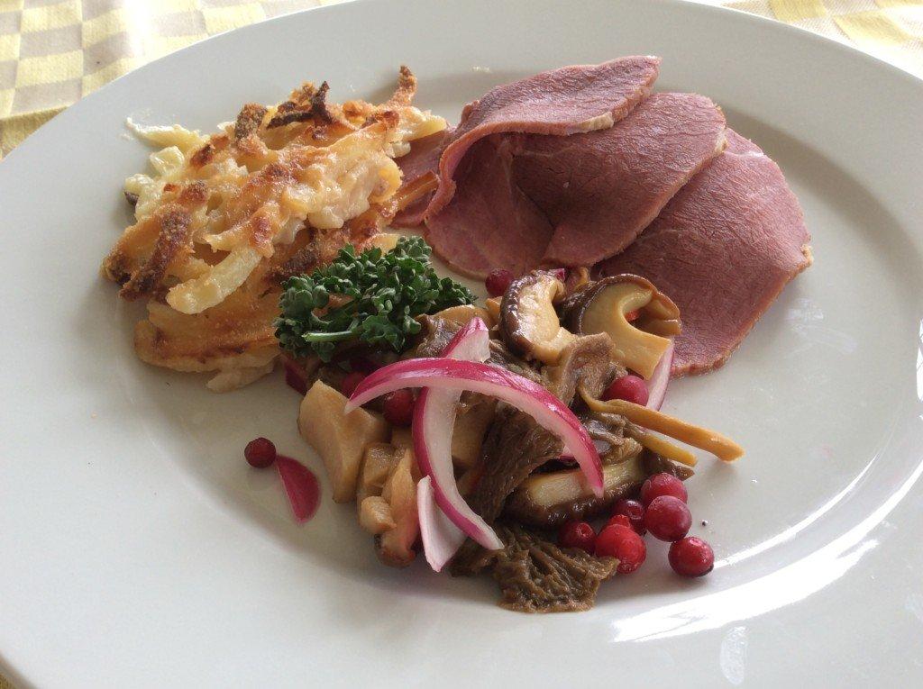 Skär köttet i tunna skivor och servera med lingon, syltad svamp och potatisgratäng.