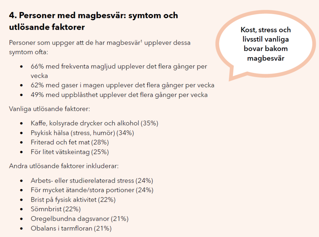 “Hela 77% av 55+arna uppger att de drabbas av problem som kurrande mage, gaser, diarré eller uppblåsthet. Samtidigt anser två tredjedelar att god maghälsa är mycket viktigt för välbefinnandet – men bara fyra av tio tycker att deras egen mage mår bra”, står det i rapporten som gjorts av Ipsos.