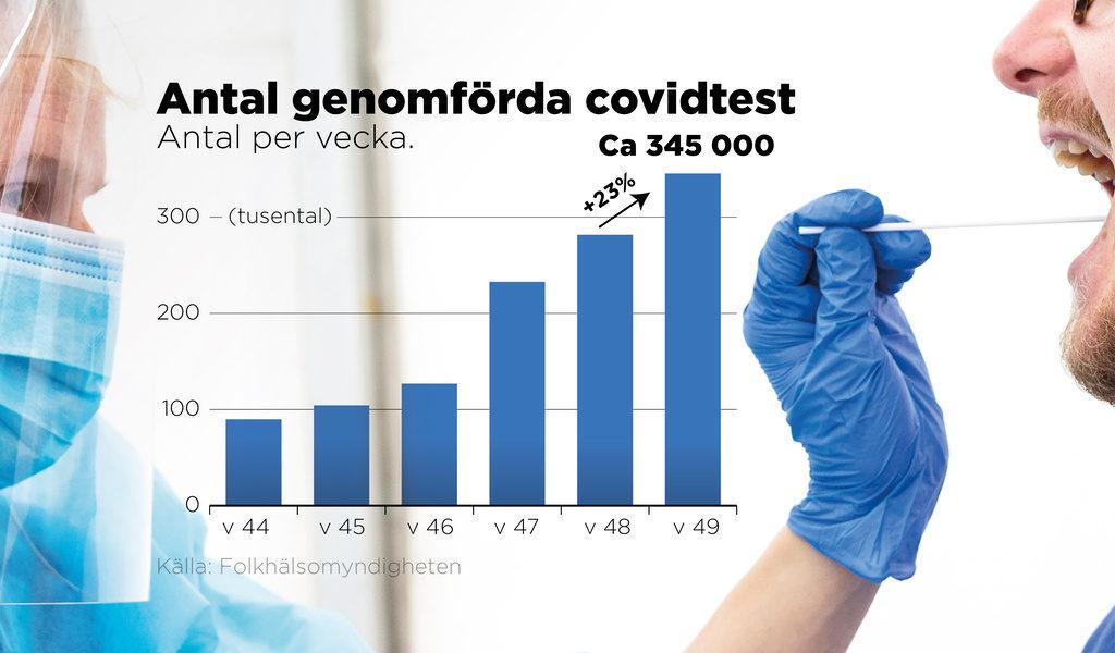 Nationellt sett ökade antalet utförda tester med 23 procent förra veckan (vecka 49) jämfört med veckan innan. Totalt utfördes 345 000 tester.