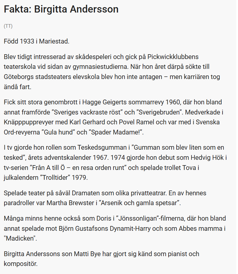 Den svenska skådespelaren Birgitta Andersson har avlidit. Andersson gick bort under söndagen efter en kort tids sjukdom, omgiven av sina barn och barnbarn, berättar sonen Matti Bye TT.