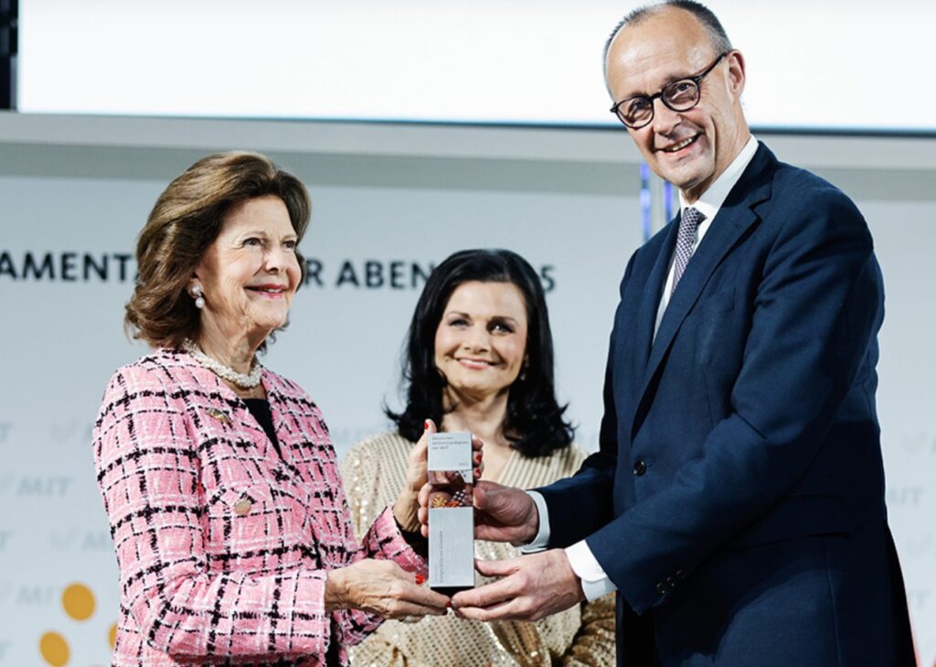 Drottning Silvia hyllas brett i Tyskland och fick under en ceremoni i Berlin motta Deutscher Mittelstandspreis för sitt arbete för barns rättigheter. Priset överräcktes av landets förbundskansler, som samtidigt prisade hennes värme och engagemang.