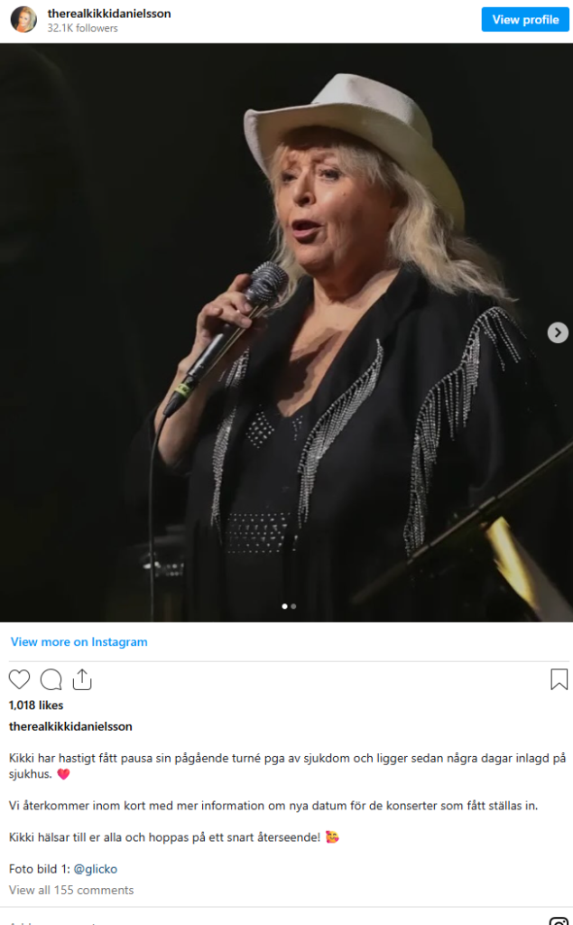 ”Kikki hälsar till er alla och hoppas på ett snart återseende”, skriver teamet i inlägget och meddelar samtidigt att mer information om nya konsertdatum kommer inom kort.