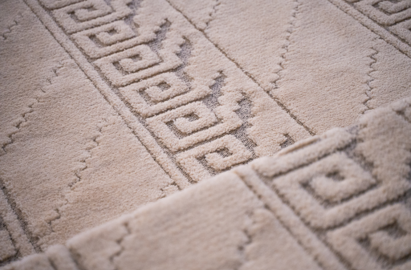 Den nyvävda mattans mönster designades av Märta Måås-Fjetterström 1934 och heter ”Vita spetsporten”.