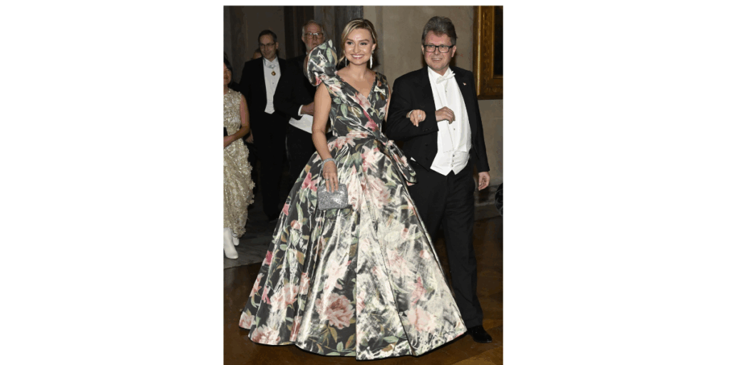 Klänningen till Ebba Busch (KD) bars av partiledaren under Nobelbanketten i Stadshuset i Stockholm 2023. Designen förverkligades av skräddarmästaren Reza Ismaili.