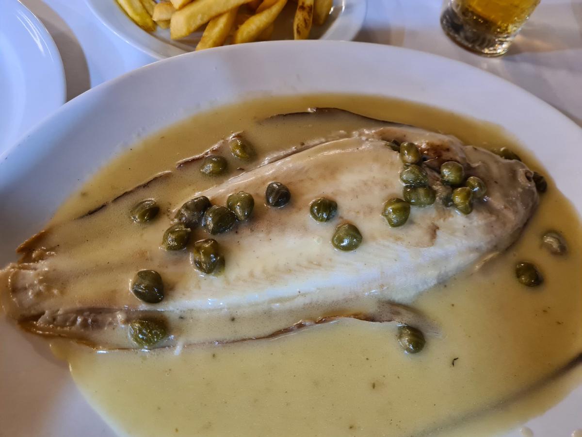Den här läckerbiten (alla sjötungor på kanariska restauranger är jättestora, och här är även kaprisen enorm) åt jag på en strandrestaurang i Meloneras på södra Gran Canaria i går. Sjötunga meunière är ju en stekt fisk – hel eller filéad – som doppats i mjöl och stekts i mycket smör. Här nere har man en egen uppfattning om hur den ska serveras: man häller en sås på smör, olja, citron och lite redning över den stekta tungan och toppar med kapris. Inte så dumt, men jag föredrar “vår” variant (som förstås är fransk från början) med bara smält och brynt smör.