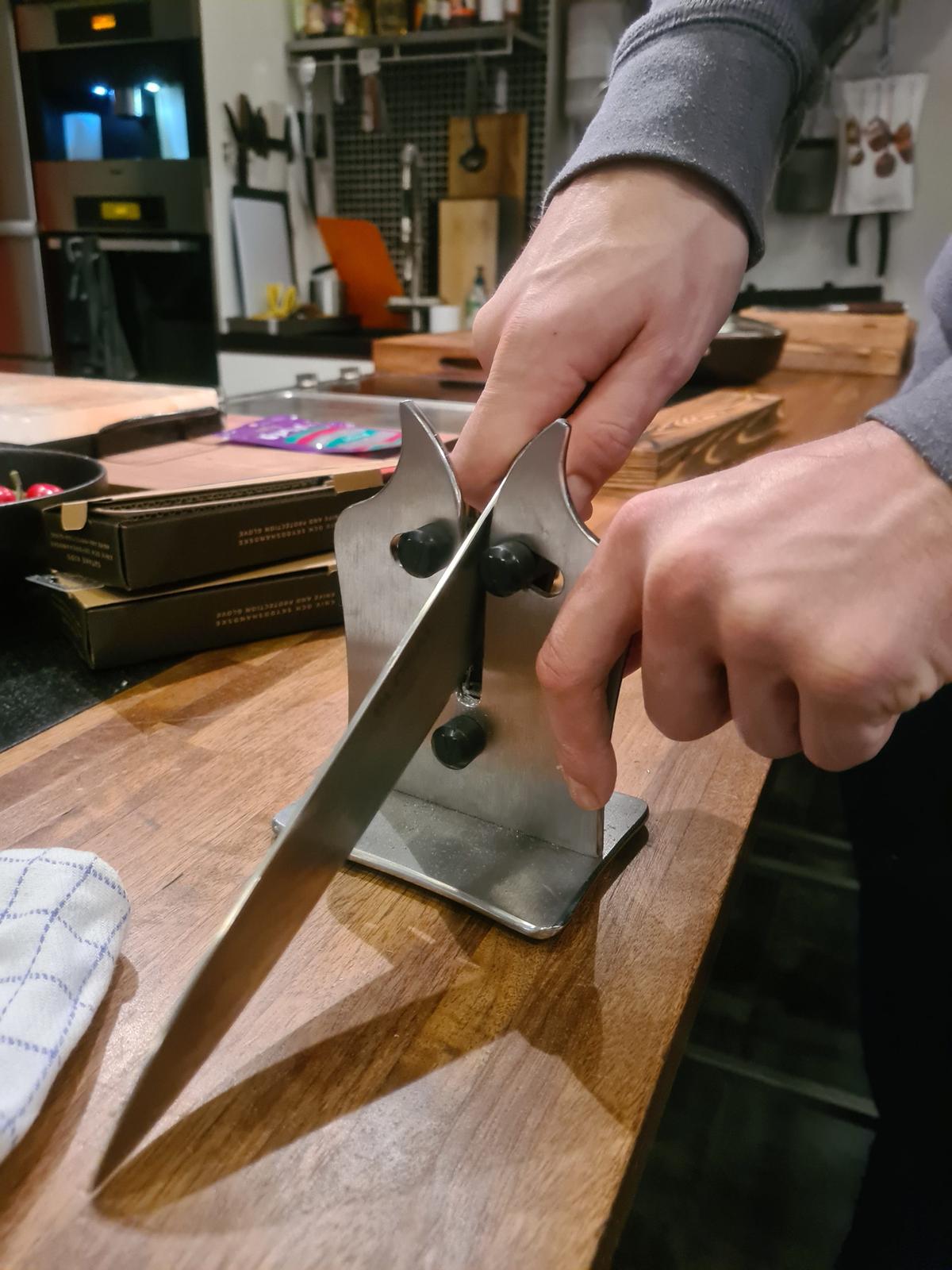 Johan använder en ny liten apparat som effektivt slipar en kniv på bara någon minut:
