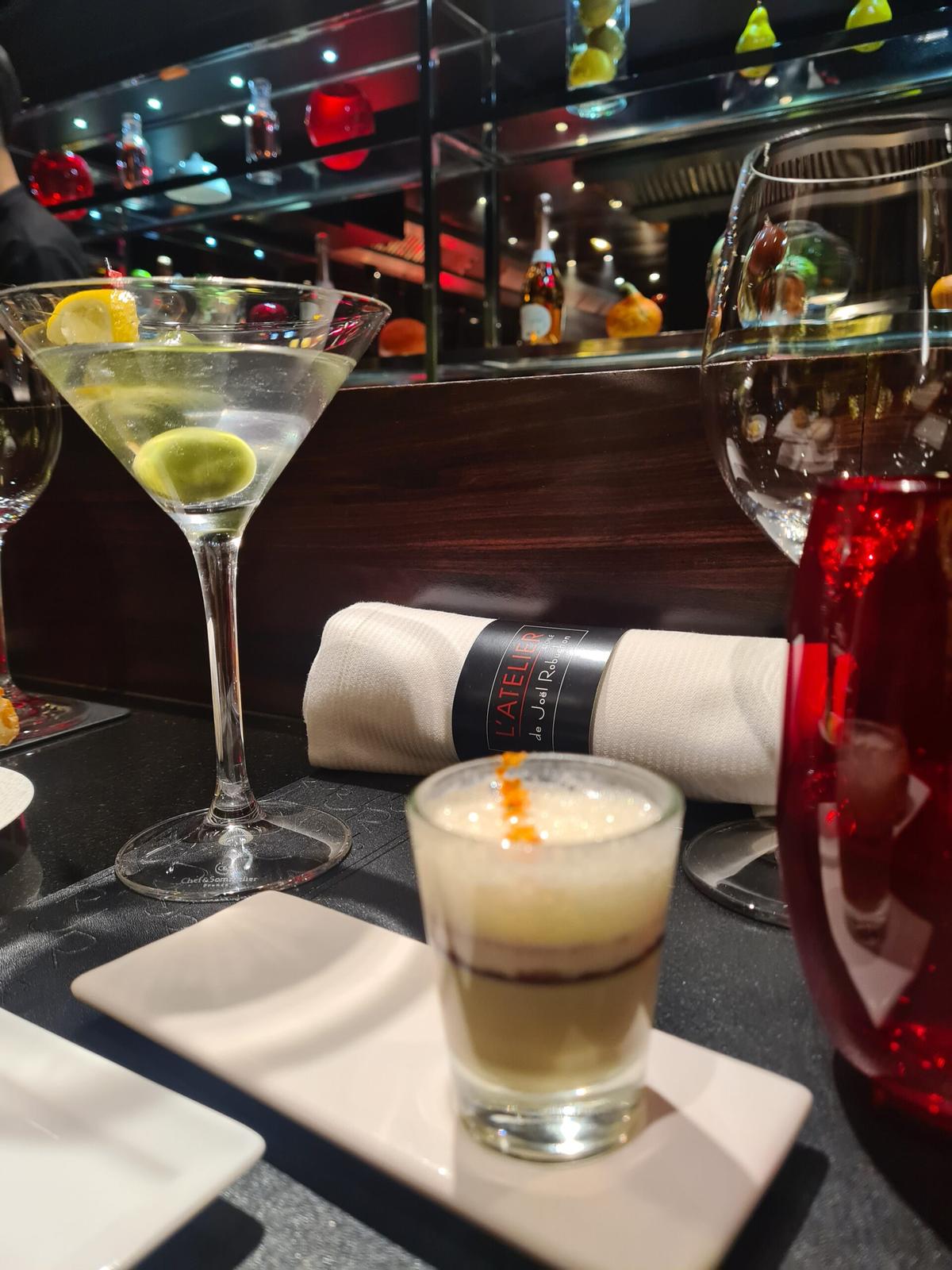 På l´Atelier de Joël Robuchon är det också mindre högtidligt än man befarar att det ska vara på en michelinkrog. Man sitter på höga barstolar vid en lång disk framför det öppna köket, det är som en teater framför en.
