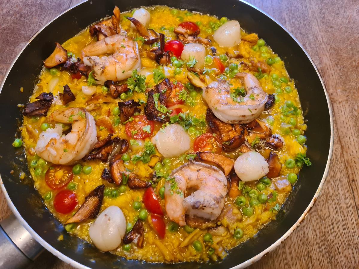 Sen var det dags för godsakerna: några pilgrimsmusslor och några jätteräkor, mycket hastig stekta i lite smör. En näve lätt brynta kantareller. En mindre näve gröna ärter. Allt vänds bara ner i riset, musslorna får absolut inte koka, då blir de sega.
