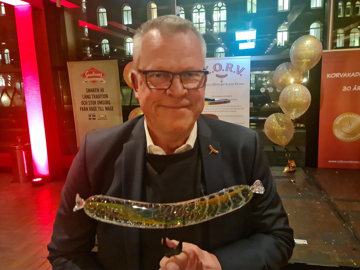 Fotbollslandslagets förbundskapten Janne Andersson älskar korv nästan lika mycket som fotboll. Och eftersom han är en “enastående ambassadör för korv och i synnerhet varmkorv med bröd” fick han i går kväll ta emot 30-årsfirande Korvakademiens hederspris, en vacker glaskorvskulptur, skapad av konstnären Kjell Engman.