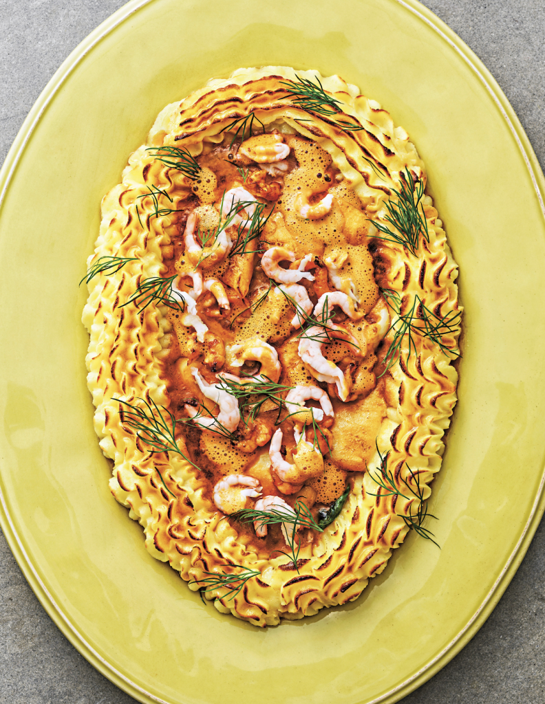 3. Duchessepotatis: Koka upp potatisen, sänk värmen och småkoka cirka 20 minuter. Häll av vattnet och låt potatisen ånga av någon minut. Passera potatisen i en potatispress. Blanda ner smör och äggula och smaka av med muskot och salt. Lägg potatismoset i en spritspåse med tyll och spritsa när det fort farande är lite varmt, det är smidigare då. Spritsa duchesse längs kanten av en ugnsfast form eller ett fat. Lägg spenaten i botten och lägg torsktärningarna ovanpå. Skeda över varm räkstuvning och gratinera mitt i ugnen cirka 15 minuter. Ta ut formen och garnera med räkor och plockad dill. Stuvning som blir över kan kokas upp igen med lite mjölk i så att den blir tunnare och serveras vid sidan om.