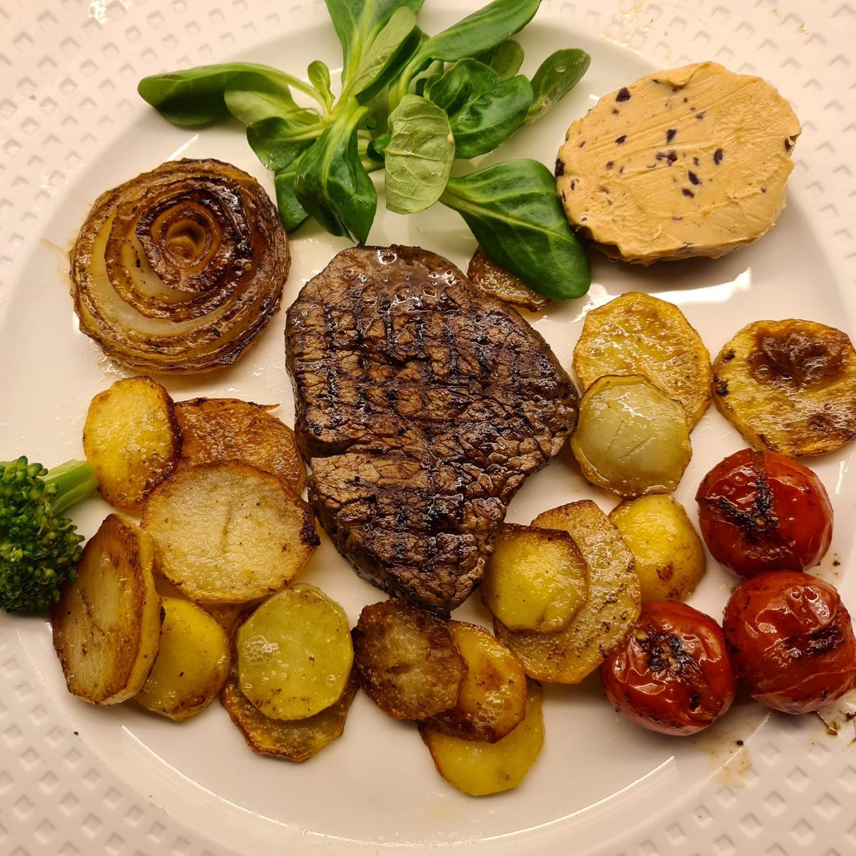 Till serveringen skär man en rejäl bit av smöret till varje köttbit och kompletterar med exempelvis råstekt potatis, något grönt och grillad tomat. Här har jag också lagt till en mjukstekt färsklök, supergott!