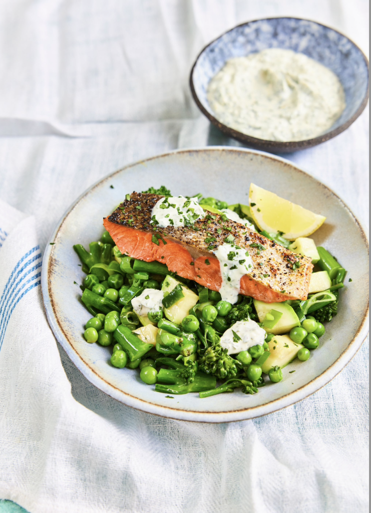 Vildlax med örter, crème fraiche och primörer
