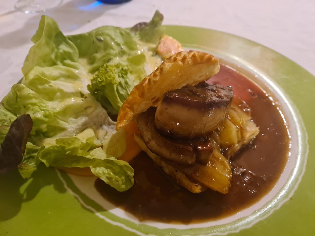 En smördegsbakelse med två rejäla skivor halstrad anklever, äppelskivor, sås på 30-årig sherry och fräsch sallad med hemgjord dressing. Ett mästerverk.