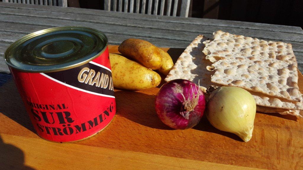 Allt som behövs för en underbar middag: surströmming, potatis, lök och tunnbröd.