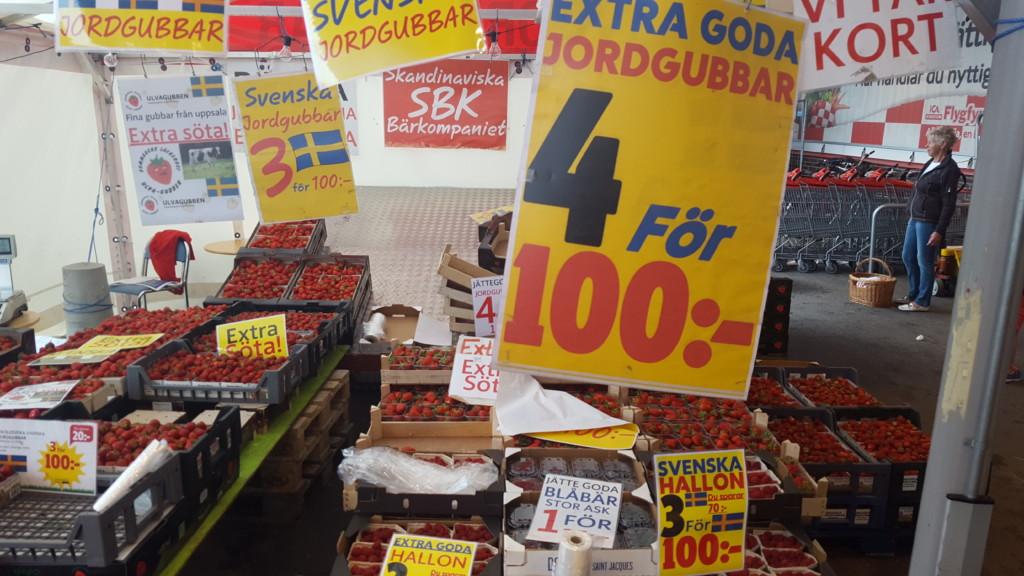 Konstiga jordgubbar i midsommar. I varje fall om man ser till priset. Samma gubbar som kostade 25 kronor litern i onsdags ställdes in i bärförsäljarnas kylskåp på kvällen - och var dubbelt så dyra när de togs fram dan efter! I dag är priset tillbaka på torsdagsnivån (se bilden)... Den här sajtens grundare, herr A, höll på att gå upp i atomer när han skulle handla gubbar på midsommarafton, klagade på det enligt A hutlösa priset och fick en mördande blick av försäljaren: -Du ska vara glad att du får köpa jordgubbar över huvud taget! Folk är tacksamma om de får tag i några i dag.