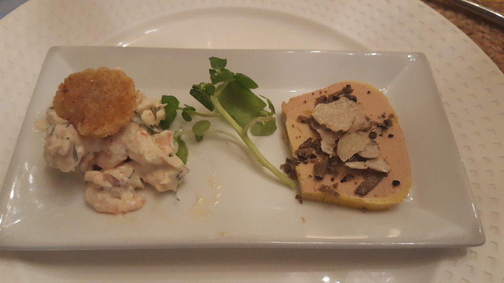 Entrérätten fick det pretentiösa namnet Tryffelsymfoni. En symfoni i två satser: till vänster en skagenröra med hummer, krabba och räkor i tryffelmajonnäs. Till höger en skiva anklever (inköpt till reapris på matmässan i Älvsjö) med både vit och svart tryffel uppepå.