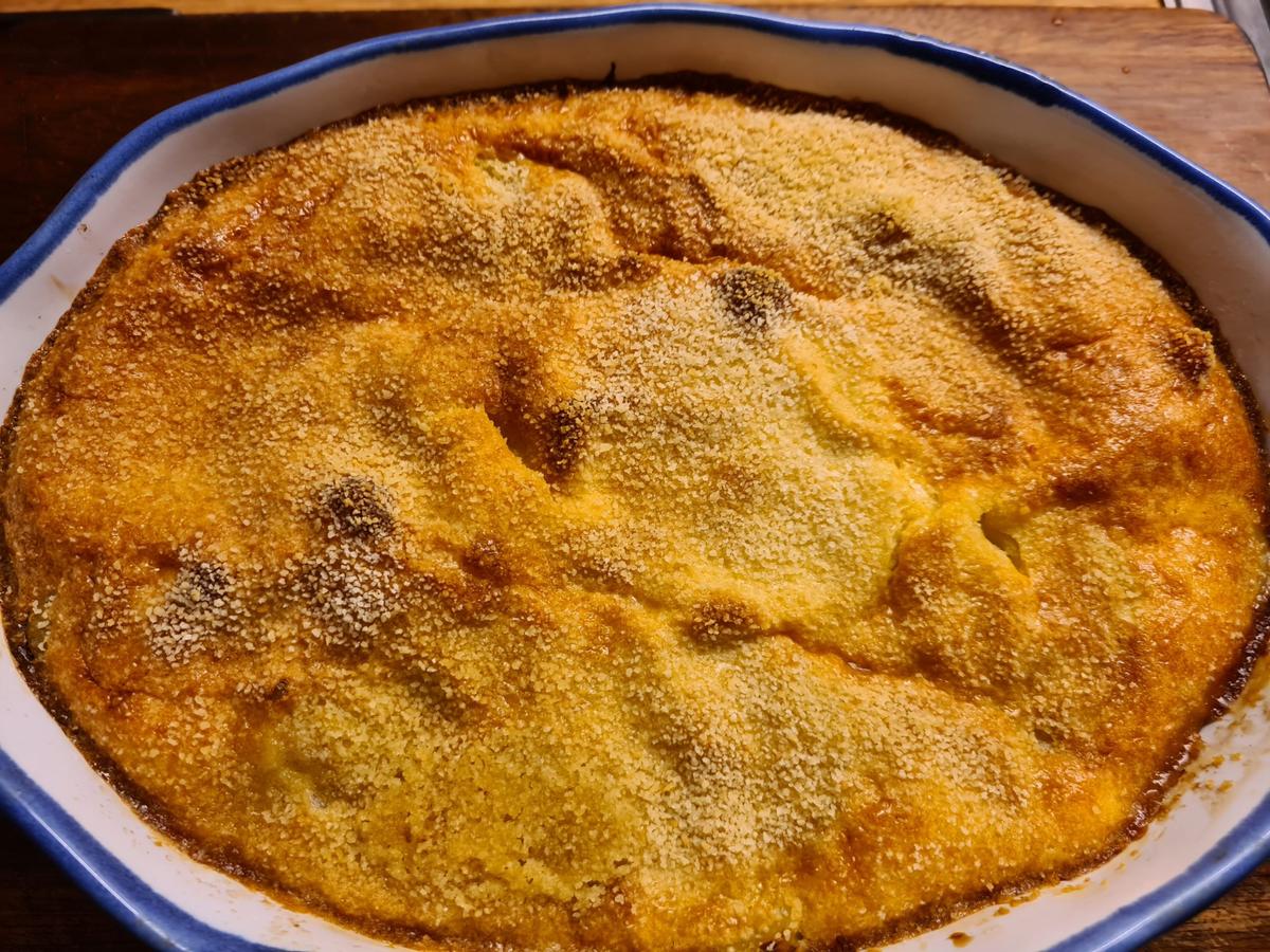 Häll grädd- och äggsmeten över innehållet i formen, täck med lite ströbröd och ett par smörklickar och grädda i 200 grader c:a 45 minuter.