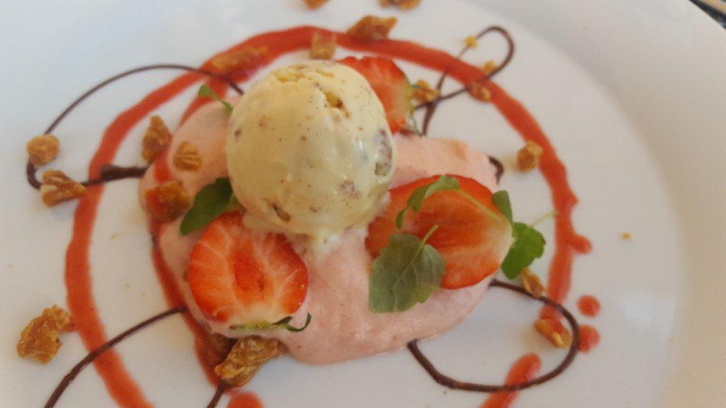 Godsakerna ser större ut på bilderna än de var i verkligheten. Vilket var bra, för då orkade man också den granna desserten, sparrisglass med limoncello, rabarberskum, jordgubbssås och mandelkrokant: