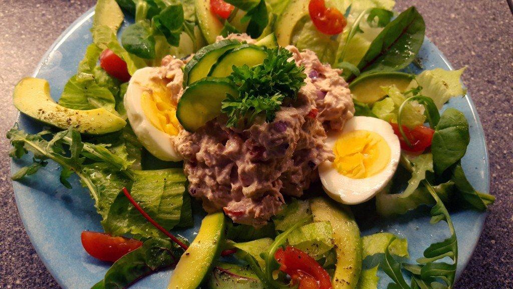 Men sånt är en kul utmaning! Så fram med en burk tonfisk, en påse sallad, lök, ägg och majonnäs – och det blev hur gott som helst!