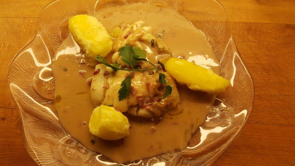 Lägg upp fisken på fat och häll smörsåsen över. Servera med mandelpotatis.