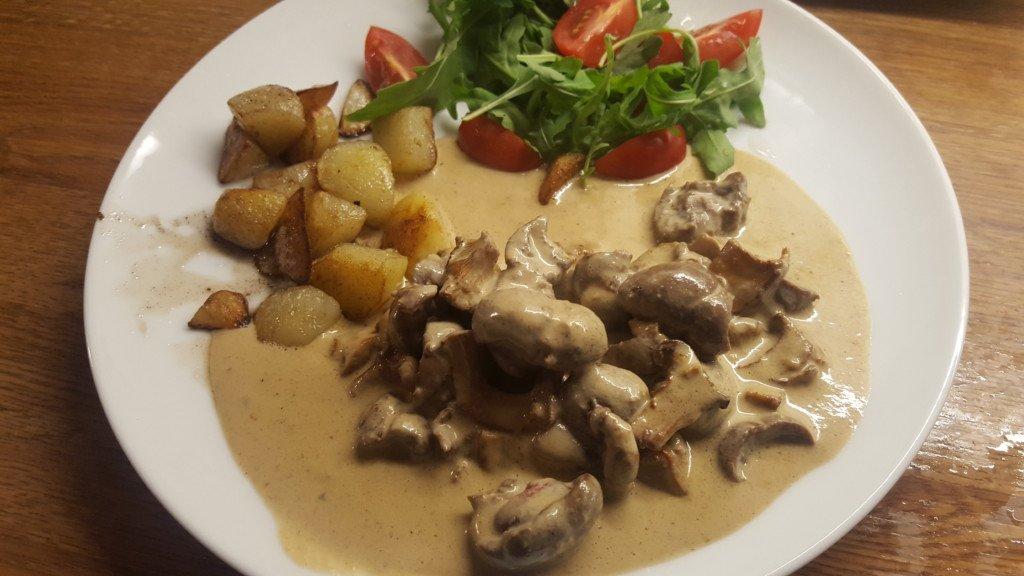 … som det inte var lätt att få tag i. Hittade en fryst liten njure i ett hörn av det stora matvaruhuset, stekte den i smör, saltade, pepprade, hällde på grädde, dijonsenap, lite köttfond och en matsked konjak och lät såsen koka ihop några minuter. På slutet fick den sällskap av en näve nyplockade, brynta kantareller och lite stekt lök.