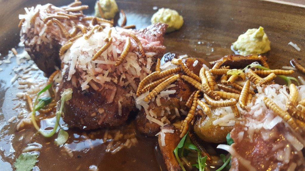 — Lammfilé med kryddrostade mjölmaskar, ört- och fårostkräm, frasig jordärtskocka, svamp och krasse: