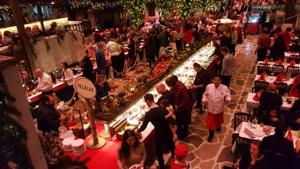 Man hör på sorlet redan när man kliver in, att det är bra. Och det syns på allas mungipor att stor som liten är på bästa tomtehumör. Råkar man stöta till varann, faller man varann om halsen och skrattar: “det gör iiiingenting, god jul!”.