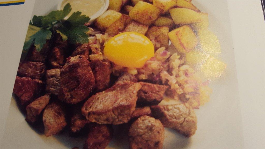 Lägg upp kött, potatis och lök i varsin hög på fyra tallrikar. Toppa med en äggula på varje. Servera senapskrämen till och garnera med persiljan.