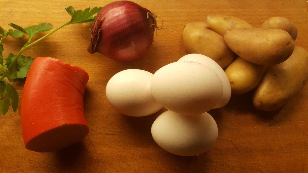 Hemma älskar vi den här rustika omeletten med potatis och lök. Korven är inte nödvändig, men såklart god.