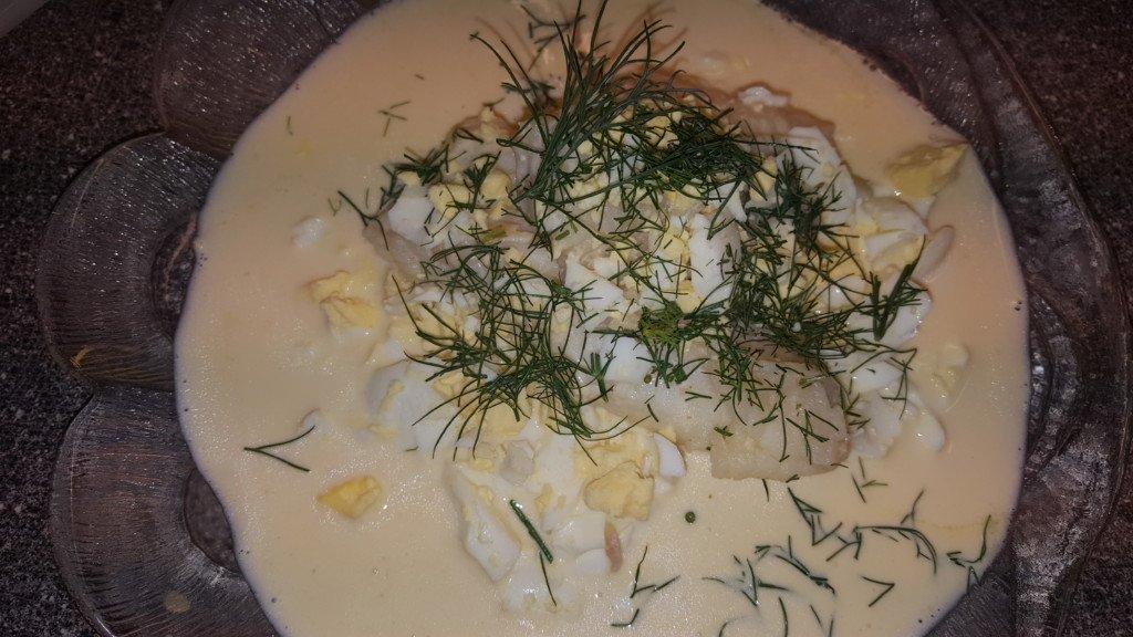 Ta upp lubben och låt den rinna av. Spetsa såsen med en del av kokspadet. Grovhacka ett hårdkokt ägg per person och strö över fisken. Häll på såsen. Servera med kokt potatis.