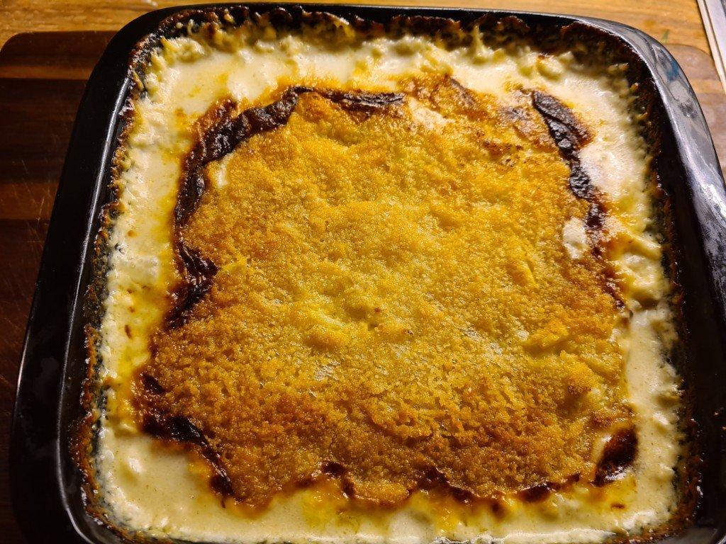Täck med ett tunt lager ströbröd och avsluta med några smörklickar.