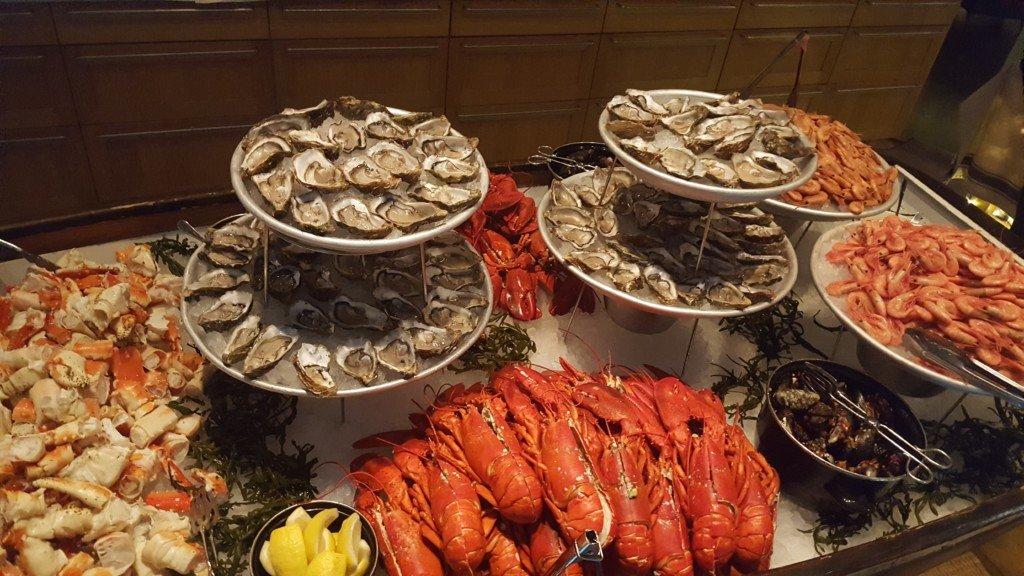 Humrarna var nordamerikanska, men färskkokta och utmärkta. Och räkorna var färska, svenska, Smögen. Den läckra kungskrabban var av högsta kvalitet. Och de havsdoftande ostronen var pinfärska.