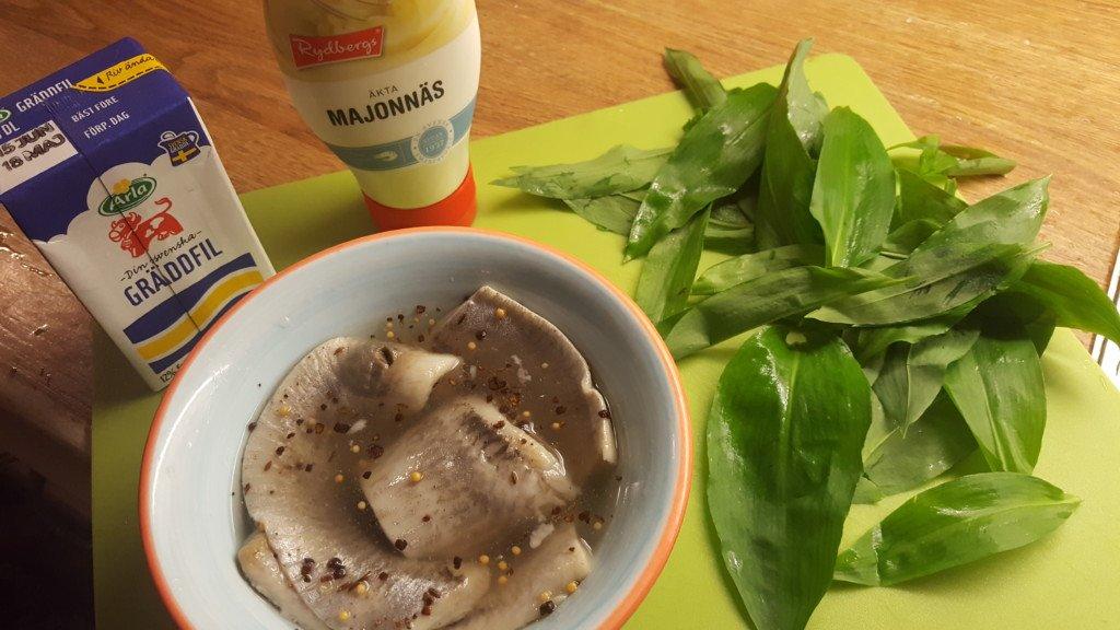 Fyra ingredienser – sill, majonnäs, gräddfil och ramslök (som det fortfarande går att få tag i, men den sjunger på sista versen). Har man inte tillgång till ramslök kan man förstås använda färsk vitlök och komplettera med hackad dill eller gräslök, men då blir det inte riktigt samma rätt. Så här gjorde jag i kväll: