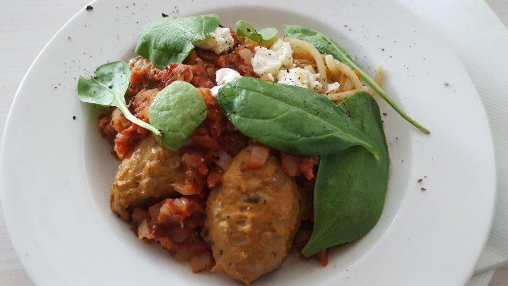 Den matglade tågchefen blandar lättkokta, nålstunna morotsstavar med spagetti, fetaost och bladspenat och häller över kycklingfrikadeller med kött från svenska kycklingar och strimlad salami samt en mjustig tomatsås med lök, vitlök och rosmarin. Såsen är han speciellt stolt över, den hittade han under en av många italiensemestrar och utvecklade vidare.