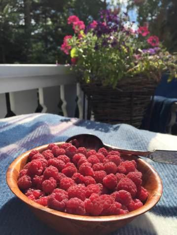 På vår lilla sommarplätt i Roslagen regnar det nästan aldrig. Jo, det är sant, och det är inte klokt: det kan ösa ner en kilometer bort – men här är det snustorrt. Otroligt nog. Så jag brukar rycka ut till hallonbuskarnas räddning med vattenslangen då och då. Är det också knäppt? Säkert – men vilken skörd det blir, du ser ju själv! Och vilken delikatess! Man kanske skulle hyra en plats på torget och sälja de röda dyrgriparna styckevis?