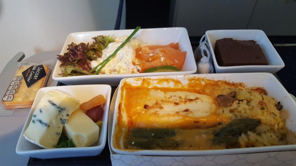 Flera gånger har vi rest charter med Thomas Cook Airlines och ätit riktigt bra. Nu hände det igen. En av oss hade beställt brunch och fick allt möjligt gott: skagenröra, lax, prinskorv, äggröra, paj, tomatsås, sallad, ost och brownie. Väl värt sina 195 kronor. Den andre åt en fiskmiddag för samma pris: