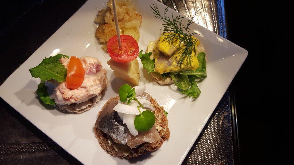 Två burkar sill (inlagd och curry), en liten bit kvarglömd varmrökt öring, majonnäs att blanda firren med, rester av Janssons frestelse i frysen och lite smör och bröd – visst räckte det till några snygga förrättssandwichar: