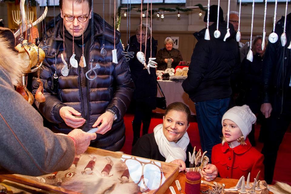 Mitt bland besökarna dök plötsligt kronprinsessfamiljen upp och deras besök fångades på bilderna som News55 visar ovan. På dessa syns bland andra Estelle, som var klädd i julens färger rött och vitt, när hon upptäckte julhalmbockar och prins Daniel som intresserat tittade på knivar.
