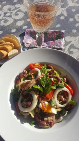 Gör en vinägrettsås och blanda ner fin, riven sallad – gärna flera sorter: ruccola, huvudsallad, frisé, vattenkrasse – samt ringar av färsk lök, tomater i skivor, en rejäl näve svarta oliver och – eventuellt, det här är alltså ett av tvisteämnena – lite kall kokt potatis.