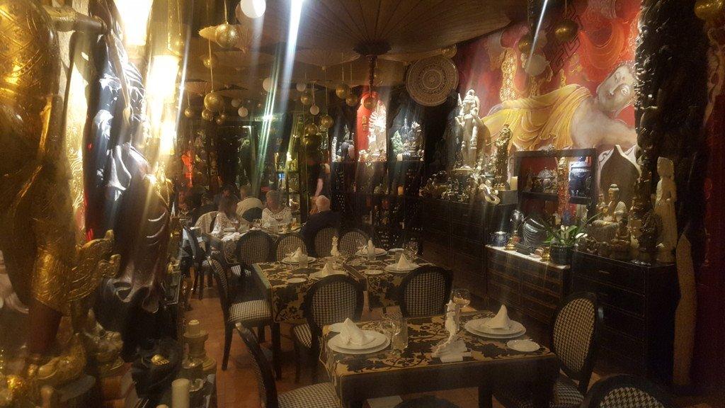 Miljön är svår att beskriva i ord, ja t.o.m. i bilder – men kolla här. Bamsiga buddastatyer, guldglänsande gudinnor, vackra vaser, glittrande glaskonst, elefanter, flaskor, mattor, tavlor, lyktor, växter; trolsk stämning i varje rum: