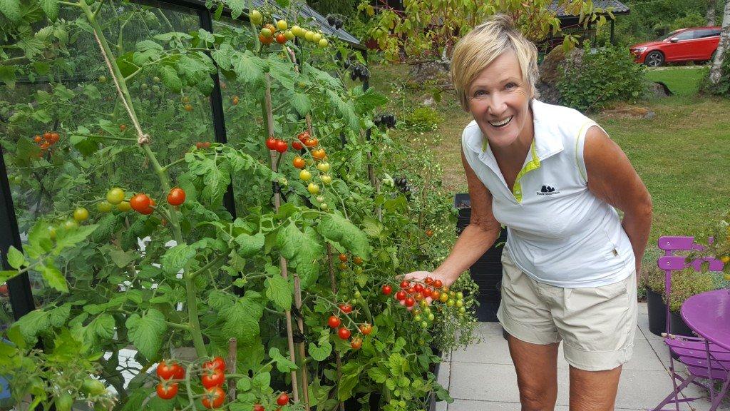 I varje vrå hemma hos Irma och Björn står det tomater. Växthuset är fullt sen länge, så röda, gula, svarta (!) och gröna tomater på mer än meterhöga plantor lyser från växthusets utsida, den stora terrassen och hela trädgården. För en tomatälskare är det som att träda in i himlen.