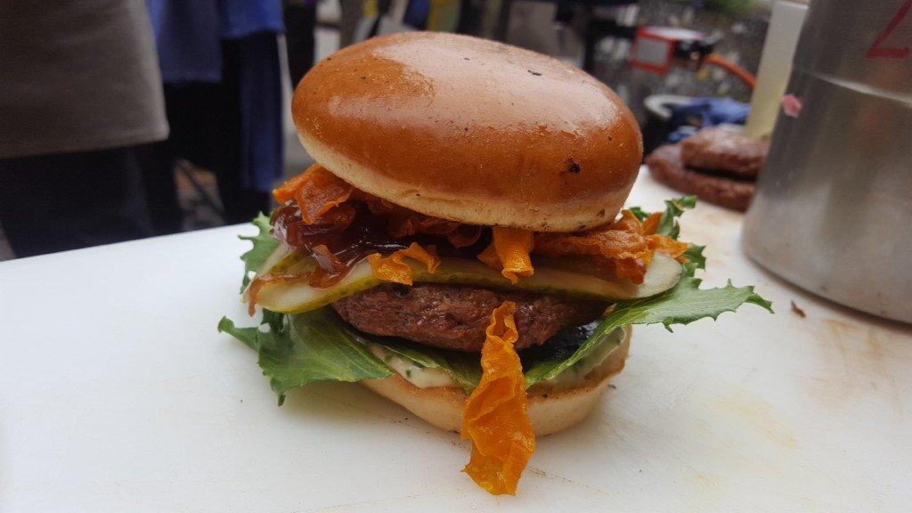 Jag blev helt paff. Burgaren var t.o.m. lätt “blodig”, tack vare rödbetssaften, och mycket saftigare än vanliga köttfärsburgare.