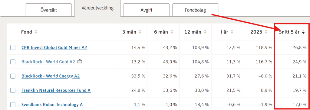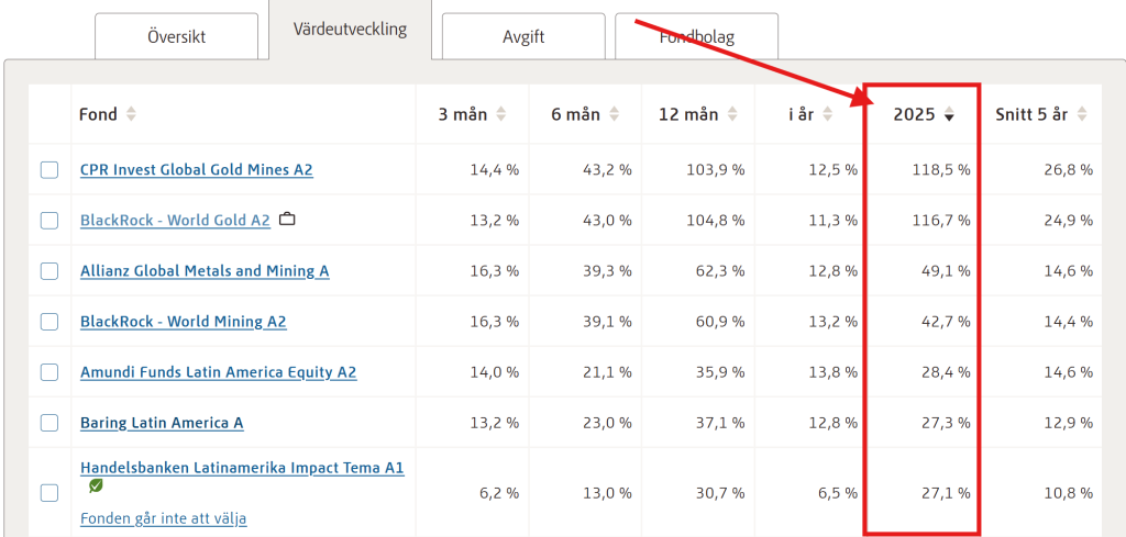 För att ha prickat in den högsta utdelningen 2025 fanns det ändå högre avkastning från vissa andra fonder. Nämnvärt är då att fyra av de fem fonder på premiepensionsfondet med högst värdeutveckling i fjol var gruvindustritunga fonder som CPR Invest Global Gold Mines A2, Black Rock World Gold A2, Allianz Global Metals och World Mining A2.